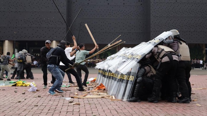 Dalam simulasi tersebut, diperagakan skenario unjuk rasa yang awalnya damai namun kemudian berubah menjadi ricuh.